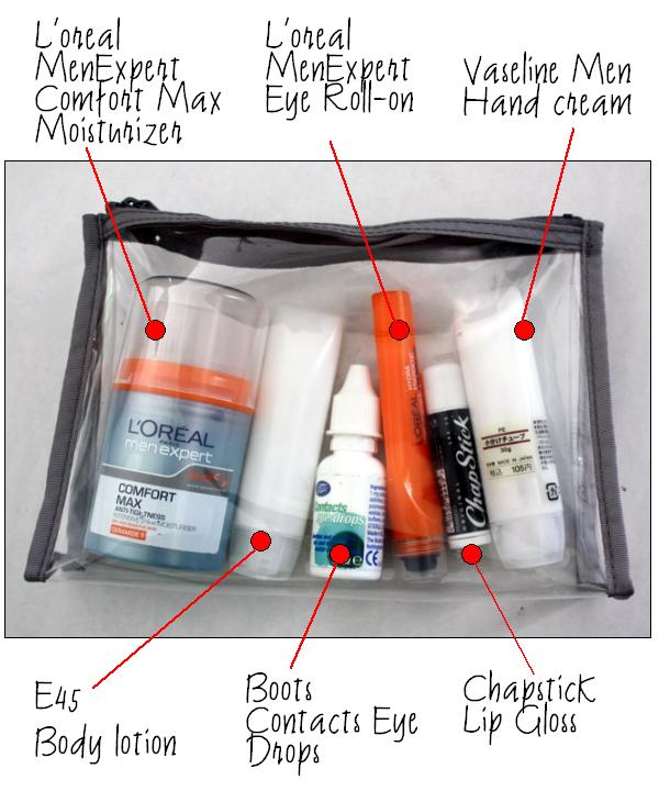 Thankfully I found a solution. I bought this vanity bag from Muji a couple of days before I fly. It's pretty cool coz I can pack all my necessities into it, and coz it's see-through then there's no hassle to take it out and put into another plastic bag. I love the simplicity of the bag, clear plastic with grey trimmings. And it's cheap too. They come in variety of sizes; the one that I got is a medium.
