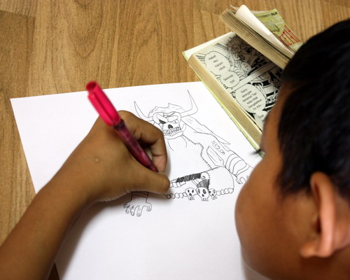 The other person is not actually involve with fashion. Instead it's the one who sketch skulls. It's my 8-year-old nephew. The other nite I saw him lying on the floor, with paper and pencil in hand, and a comic book on one side. I asked him what he's doing. And voila... I took a peek and get totally amazed with what he did. It's an exact copy of one of the comic characters in the book that he drew himself. And it's a skull monster with some skull belts around the waist. Isn't it cool? And know what, he also did a caricature of my other nephew that nite too, and it's so funny to see how he can capture every details of him. And that's by an 8-year-old... Awesome! =)