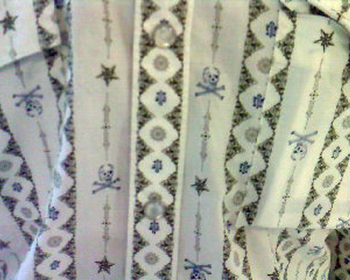 I thought I'm the only one who like skull printed things. But it turns out that some close people around me also seem to 'absorb' the idea as well. Like the other week while having a lunch with my friend, A, I don't realise that the shirt that he's wearing is not just a printed vertical stripes. I did compliment on the shirt coz it looks cool... but when I looked closer, I was about to scream 'hey, skull!!!' when I see the in-between stripes are actually skull (I think I did said out loud that day, haha!). I asked him where did he get it? It's from Juicy Couture, New York - he bought it while having a fashion internship there quite some time ago. Btw, I think it's cool. =)